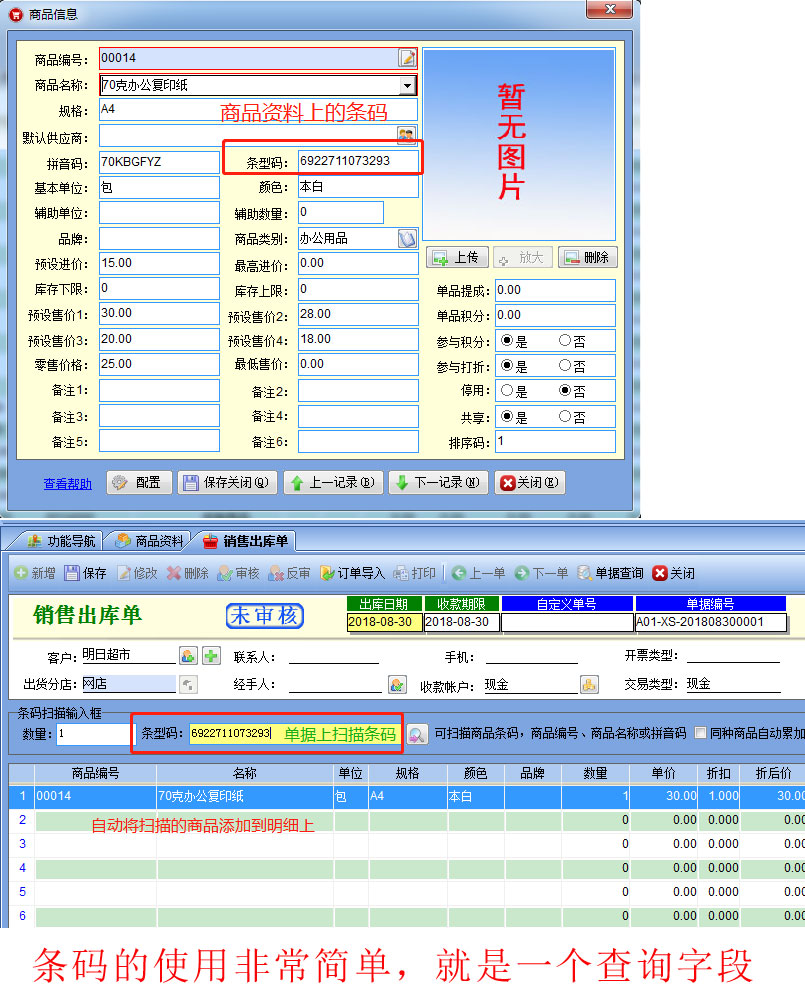 3.開單時(shí)將光標(biāo)定位在【條型碼】框里面然后掃描條碼就能自動(dòng)查詢到該條碼對(duì)應(yīng)的商品,而不易出錯(cuò),迅速,高效率的開單。