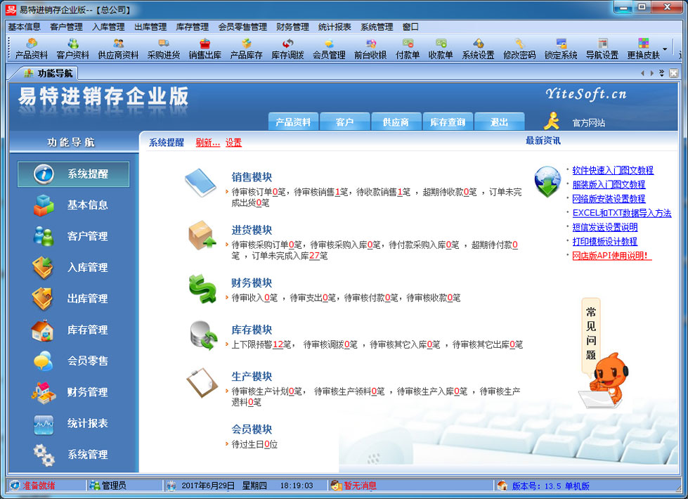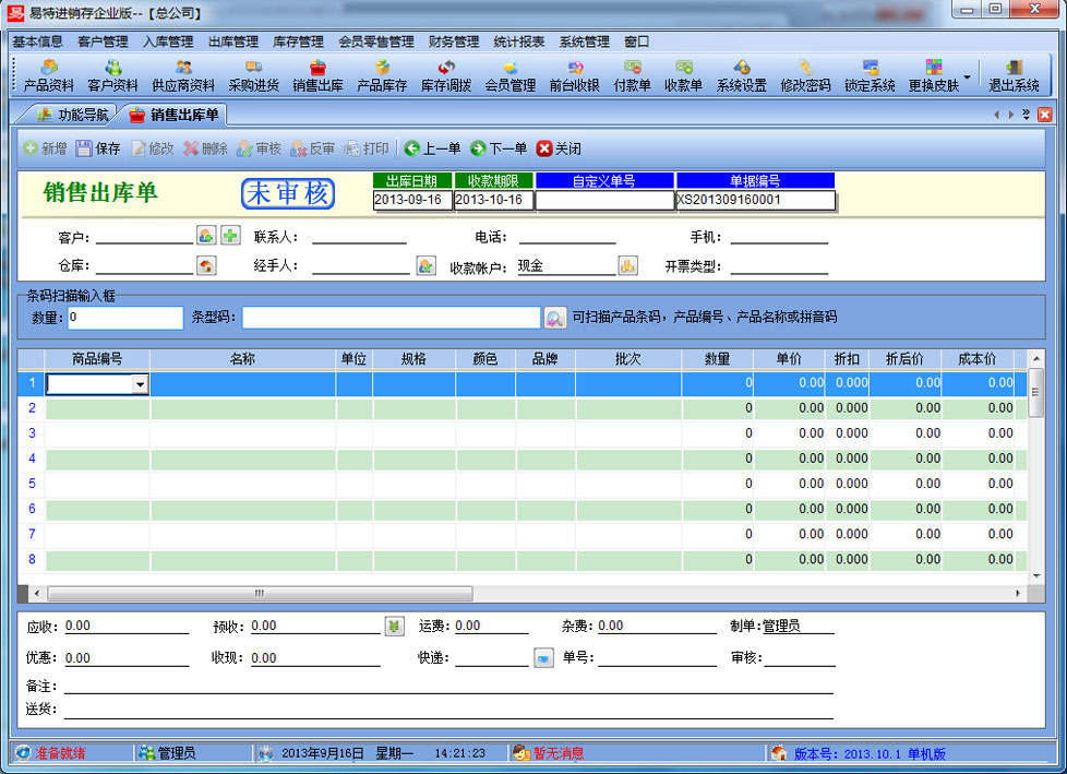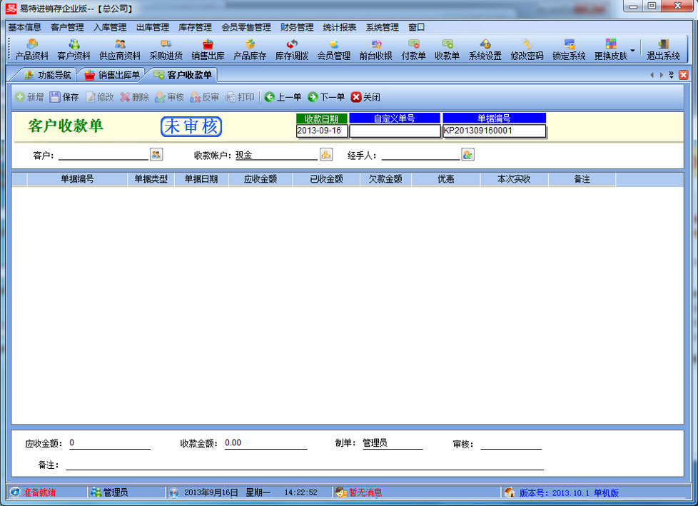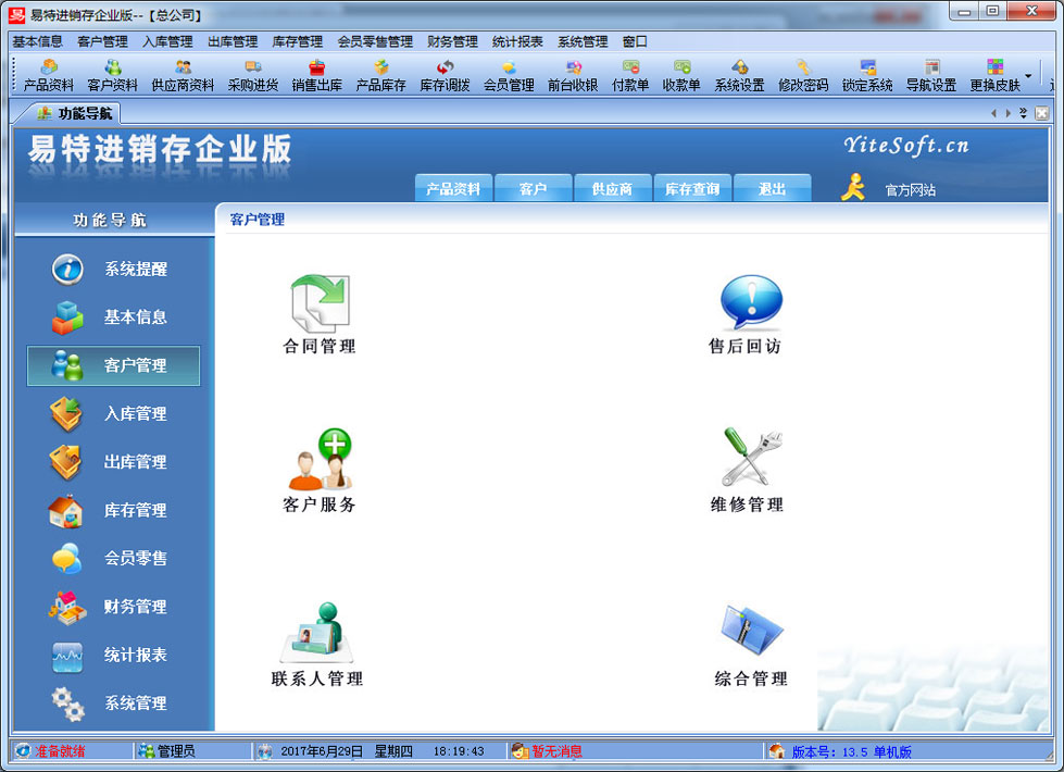 易特進(jìn)銷存企業(yè)版是一款專業(yè)的進(jìn)銷存管理軟件,其中包含商品銷售管理系統(tǒng) ,庫存管理系統(tǒng)(倉庫管理系統(tǒng)),財務(wù)和報表系統(tǒng)等子模塊。軟件界面設(shè)計簡潔,美觀,其人性化的軟件流程,使普通用戶不需培訓(xùn)也能很快掌握軟件操作使用方法,上手極易。強(qiáng)大報表與集成查詢功能是本軟件的最大特色,所有功能在用戶需要的使用地方自然體現(xiàn),不用打開多個窗口重復(fù)查詢。易特進(jìn)銷存軟件廣泛適用于企業(yè),商貿(mào)公司,個體門店等用于商業(yè)銷售管理, 庫存管理,財務(wù)管理等,客戶管理,員工管理等場合,是您企業(yè)進(jìn)行信息化管理的強(qiáng)大工具。 客戶管理:客戶合同、聯(lián)系人,售后服務(wù)及維修管理等。 入庫管理:進(jìn)行產(chǎn)品采購入庫,采購?fù)素,進(jìn)貨單據(jù)和退貨單據(jù)查詢,供應(yīng)商往來帳務(wù),供應(yīng)商付款。 出庫管理:銷售出貨,客戶退貨,銷售單據(jù)和客戶退貨查詢,客戶往來帳務(wù),客戶付款。 來料加工:針對客戶提供材料加工產(chǎn)品方式,計算加工費(fèi)用。 庫存管理:包括庫存之間貨品調(diào)拔,庫存報損、報溢,庫存盤點(diǎn)功能。 拆分組裝:整進(jìn)散出,或是整出散進(jìn)等可以自由的拆分組合產(chǎn)品。 財務(wù)管理:預(yù)付款、預(yù)收款,應(yīng)收應(yīng)付款,收入支出,發(fā)票管理。 會員零售:可實(shí)現(xiàn)工廠加門店的方式,工廠走銷售流程,門店走會員零售流程。 統(tǒng)計報表:完整的統(tǒng)計查詢功能,每張單據(jù)每次業(yè)務(wù)金額都可以清楚的反映。 權(quán)限管理:可添加刪除系統(tǒng)操作員帳號,強(qiáng)大的權(quán)限控制,可以設(shè)置某用戶對某窗口某個按鈕的權(quán)限。 打印設(shè)計:可對系統(tǒng)內(nèi)每個單據(jù)進(jìn)行打印的格式設(shè)計,可以導(dǎo)出,導(dǎo)入,每個操作員可設(shè)計自己的打印格式。 界面設(shè)計:系統(tǒng)窗口界面名稱可以自定義設(shè)計,表格的顯示順序,寬度,是否顯示等,每個操作員可以設(shè)計自己的界面。 系統(tǒng)設(shè)置:可以靈活設(shè)置系統(tǒng)小數(shù)位數(shù),可選0-6位,讓帳務(wù)更精確,可對以往數(shù)據(jù)進(jìn)行選擇性的清除,以便系統(tǒng)初始化。 數(shù)據(jù)備份:可隨時對系統(tǒng)數(shù)據(jù)庫進(jìn)行安全備份,以防數(shù)據(jù)丟失。 |