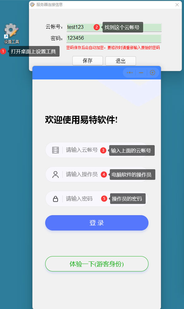 1.先安裝電腦版的軟件,桌面上有一個(gè)設(shè)置工具,打開后輸入云帳號和密碼。 2.打開微信小程序,在云帳號上輸入和設(shè)置工具一樣的帳號。 3.在操作員這里輸入電腦軟件的操作員,如果是第一次新裝軟件,輸入【管理員】,密碼默認(rèn)為123456,進(jìn)軟件后請修改密碼。 4.如果有多個(gè)操作員,進(jìn)軟件后,在軟件上【系統(tǒng)管理】--【操作員設(shè)置】,新增用戶,可以添加多個(gè)操作員帳號,電腦和小程序都可以登陸這個(gè)帳號 |